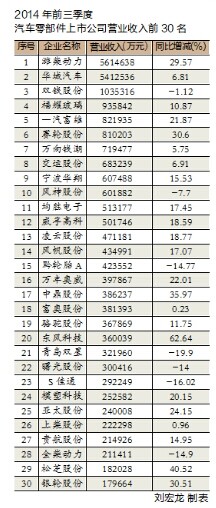 截止到10月底,统计在内的沪深股市上市的81家汽车零部件企业已经全部公布了今年三季度业绩报告。根据各家企业的经营状况来看,今年我国汽车零部件行业整体走势相比去年同期持续向好,许多企业借助国际化资源实现规模扩张。
